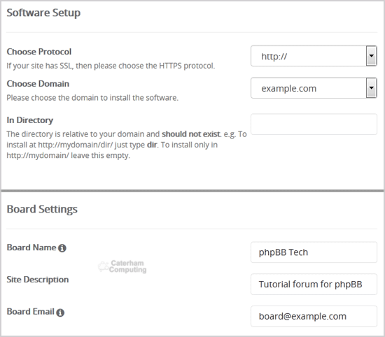• In Directory: If you want to install this in a directory, for example example.com/forums, enter the directory name. Otherwise, leave this blank to install in your main domain example.com
